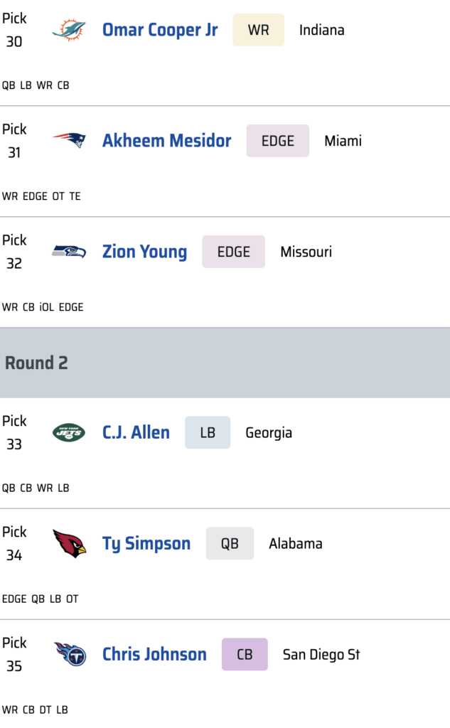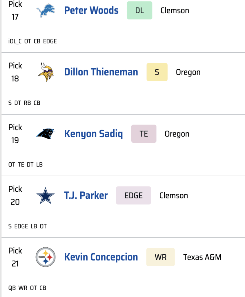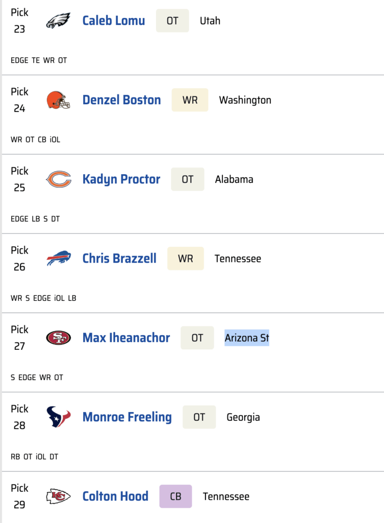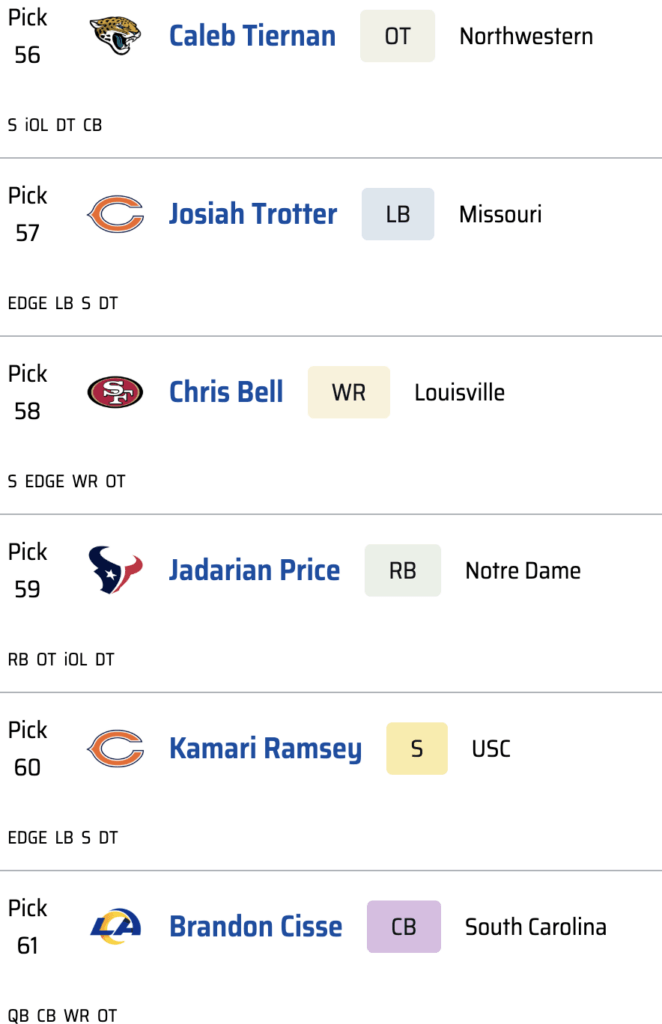 After a run of mostly defensive players, Kansas City has the good fortune of seeing the best wide receiver in the draft fall right into its lap. It makes sense for other teams to wait on a wideout given how deep this class is, but Carnell Tate is too talented and fills too great a need for the Chiefs to pass on him. For Andy Reid and Patrick Mahomes, this is a dream scenario. For the rest of the division, it is nightmare fuel.