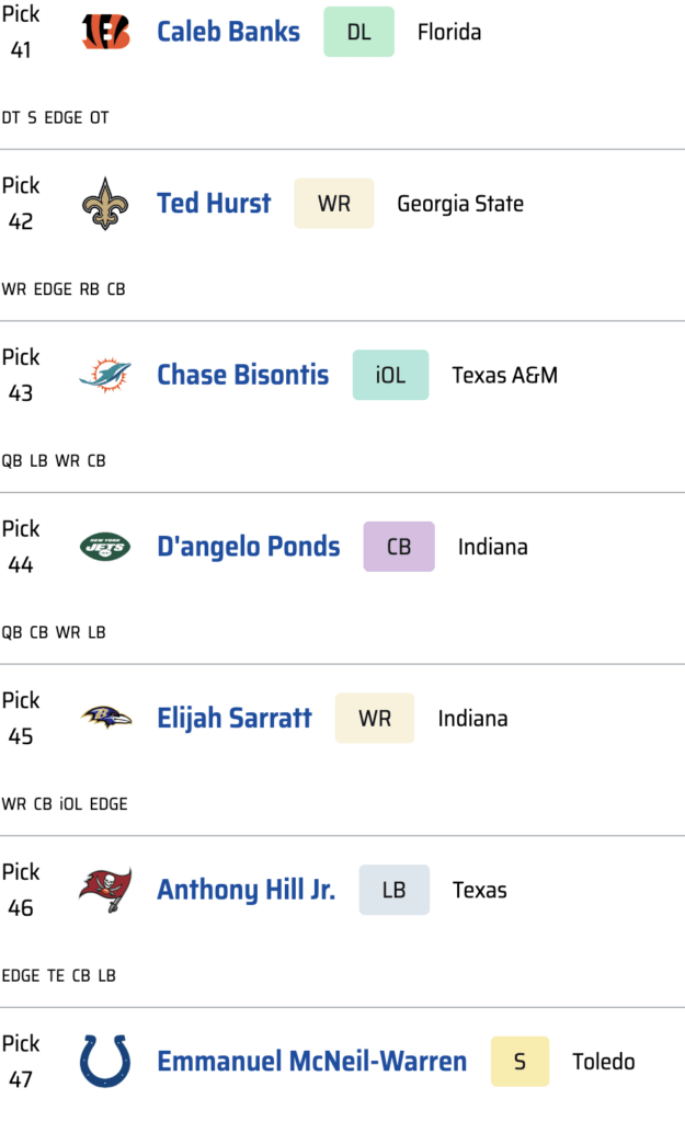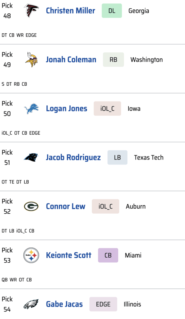 Denver must continue dedicating resources to helping Bo Nix, and this pick does exactly that. The Broncos currently have some interesting pieces at tight end, but they lack someone who can handle all of the traditional responsibilities the position demands.